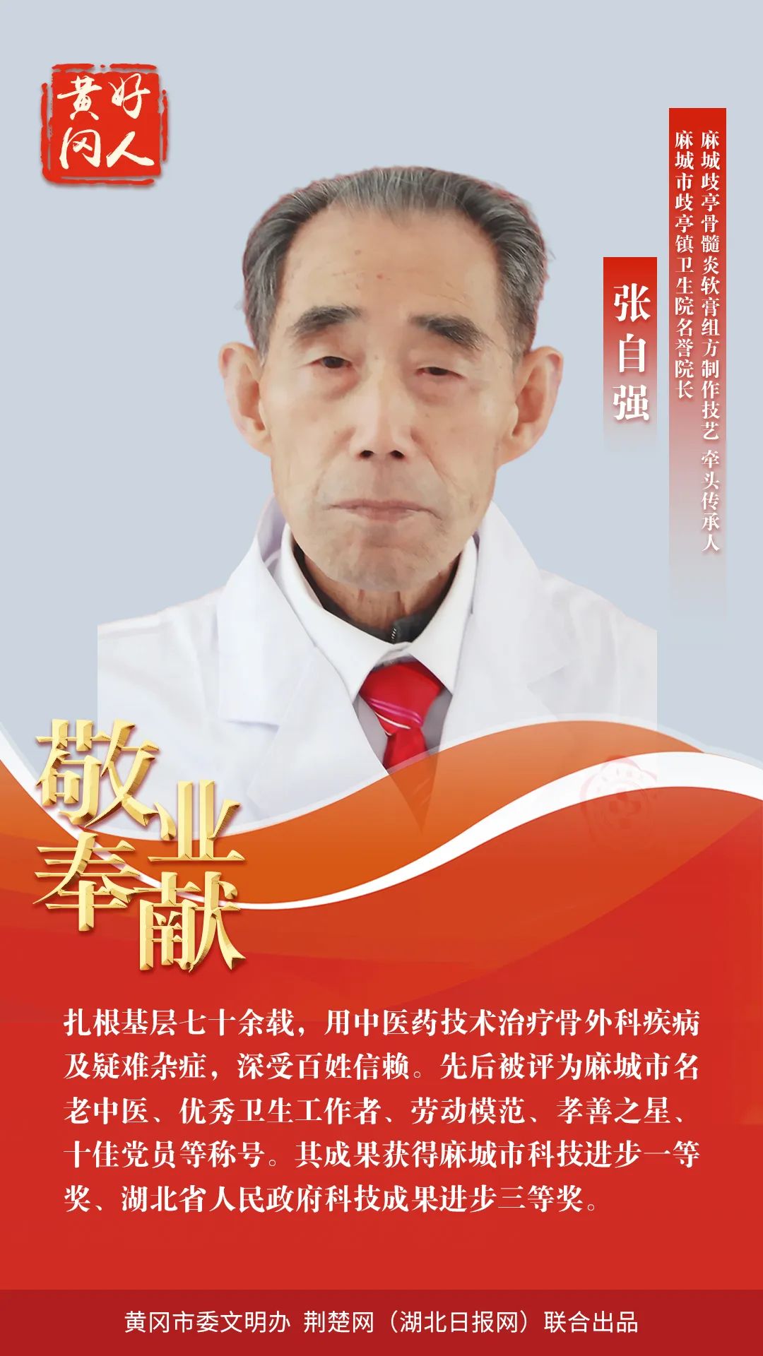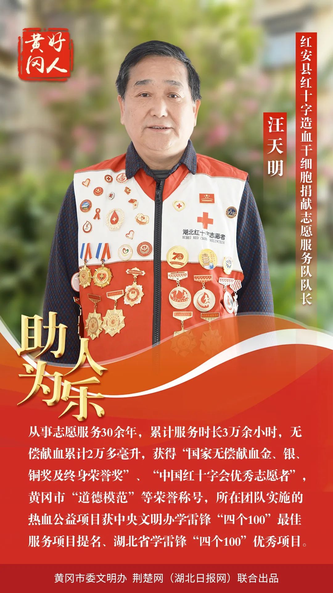 本期“黃岡好人”共有5組好人入選。他們中,有“見義勇為,勇救落水者”的秦遵照;有“扎根基層七十余載老醫(yī)”的張自強;有“孝老愛親,待叔如父,被譽為大山里‘好兒媳’”的丁衛(wèi)香;有“助人為樂,從事志愿服務30余年的”的汪天明;有“助人為樂,創(chuàng)建了‘向陽花’留守兒童之家品牌”的張靜。