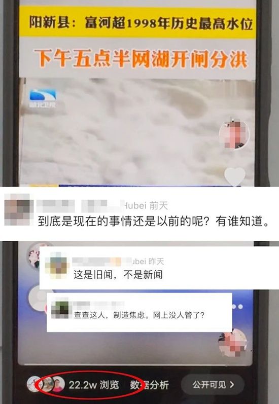 該視頻一經(jīng)發(fā)布,立即引起了廣大網(wǎng)民的關(guān)注和擔(dān)憂,誤導(dǎo)網(wǎng)民認(rèn)為發(fā)生了洪災(zāi)險情。相關(guān)視頻發(fā)布后瀏覽量達(dá)22.2萬人次,在一定程度上引發(fā)了公眾恐慌。