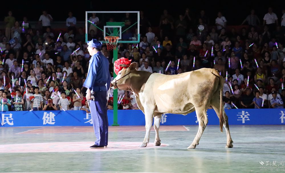 19時30分許,開幕式開始,聲聲震天的威風鑼鼓、剛勁有力的武術表演、青春動感的健身舞蹈以及活力十足的歌曲串燒,一次次引來現(xiàn)場的歡呼喝彩。當工作人員牽著“冠軍牛”進入場地那一刻,現(xiàn)場的熱烈氛圍再次被引向高潮。