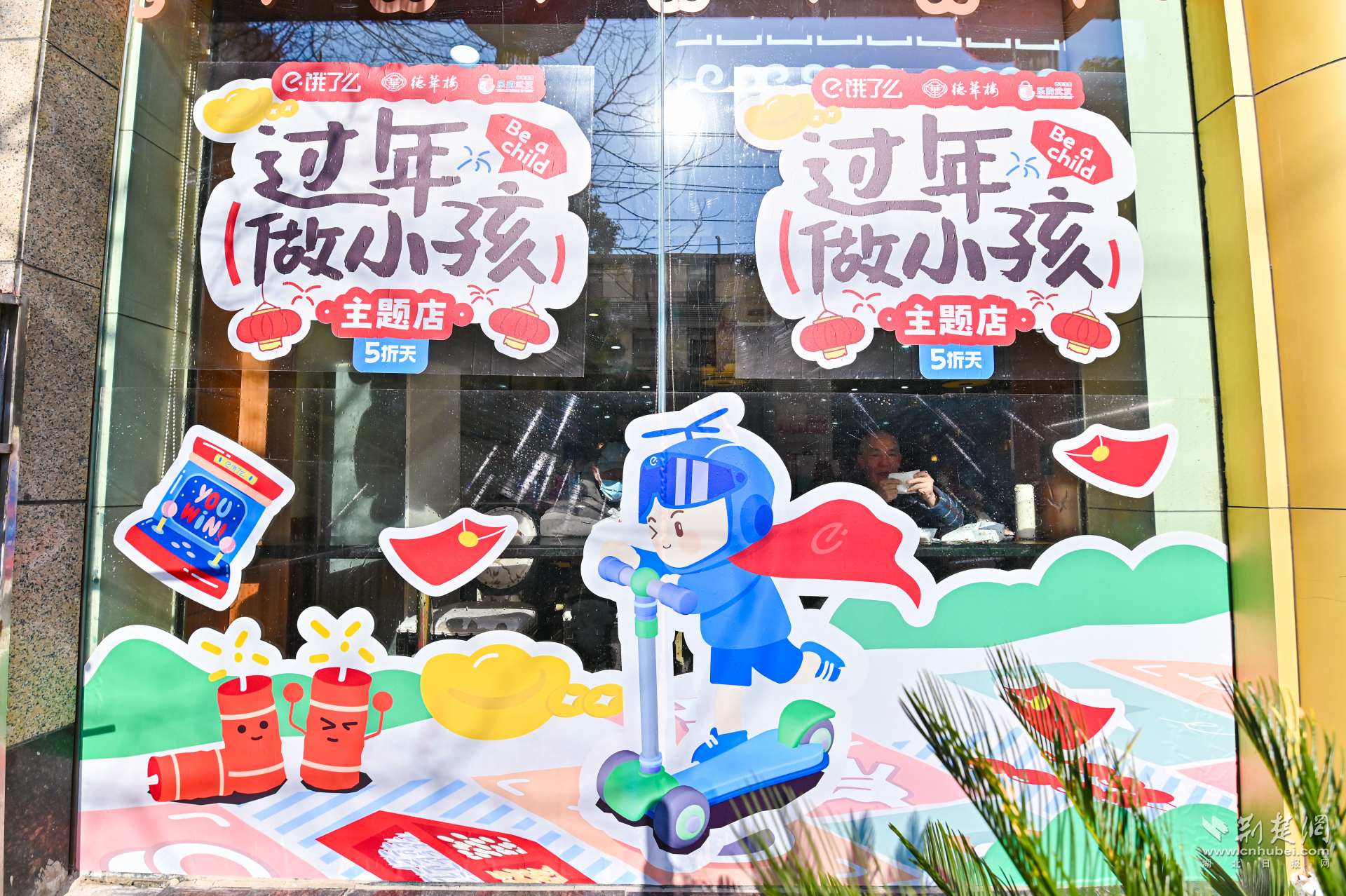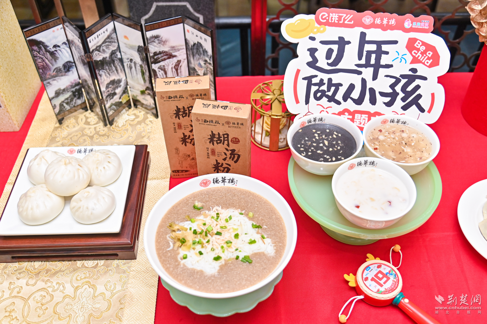 當天,德華樓六渡橋店變身年貨快閃店,門口大鐵鍋現(xiàn)炸的熱氣騰騰的肉圓子,一字排開的水磨年糕、餃子等,以及排著長隊打年貨的武漢市民,讓武漢新春濃度再加碼。走近店內(nèi),仿佛回到童年。地板上跳格子的地貼,喚醒了與童年小伙伴在街巷里份跳格子的好時光,呼應著墻面上以“不想長大”各種趣味招貼畫,讓人備加想念童年的滋味和年味。