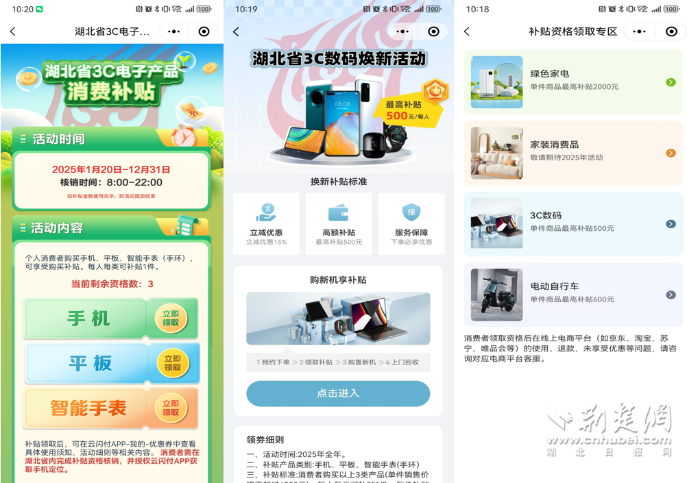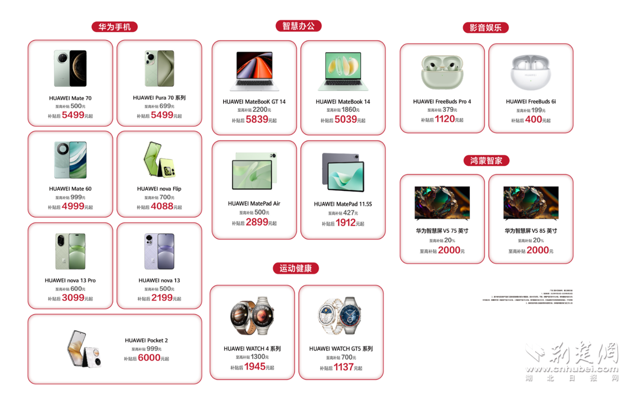 荊楚網(wǎng)(湖北日報(bào)網(wǎng))訊 (通訊員 高洋)2025年1月20日,“國補(bǔ)”政策首次擴(kuò)圍至消費(fèi)電子行業(yè)。對個人消費(fèi)者購買華為手機(jī)、平板、智能手表手環(huán)等3類數(shù)碼產(chǎn)品(單件銷售價格不超過6000元),按產(chǎn)品銷售價格的15%給予補(bǔ)貼,每位消費(fèi)者每類產(chǎn)品可補(bǔ)貼1件,每件補(bǔ)貼不超過500元。對于想要購買華為手機(jī)的消費(fèi)者來說,這波優(yōu)惠力度拉滿。