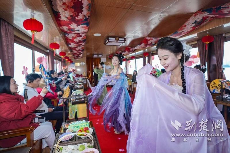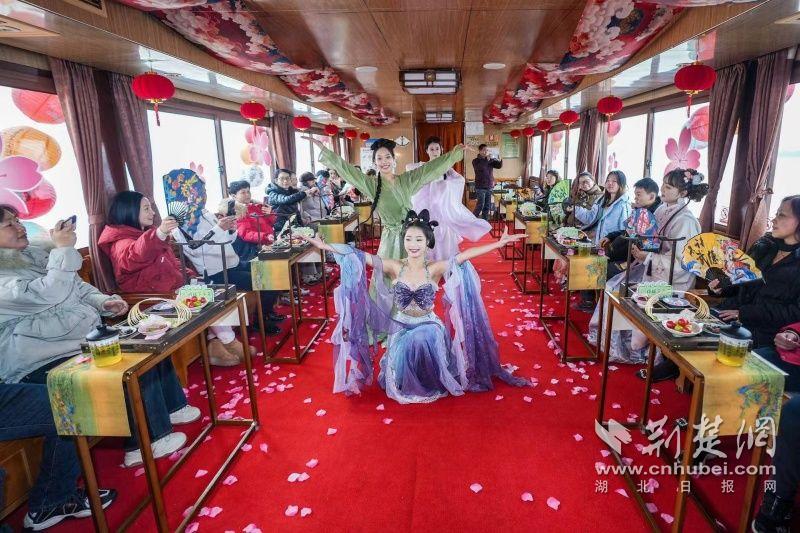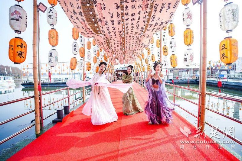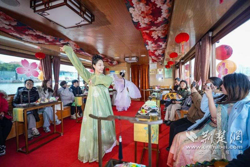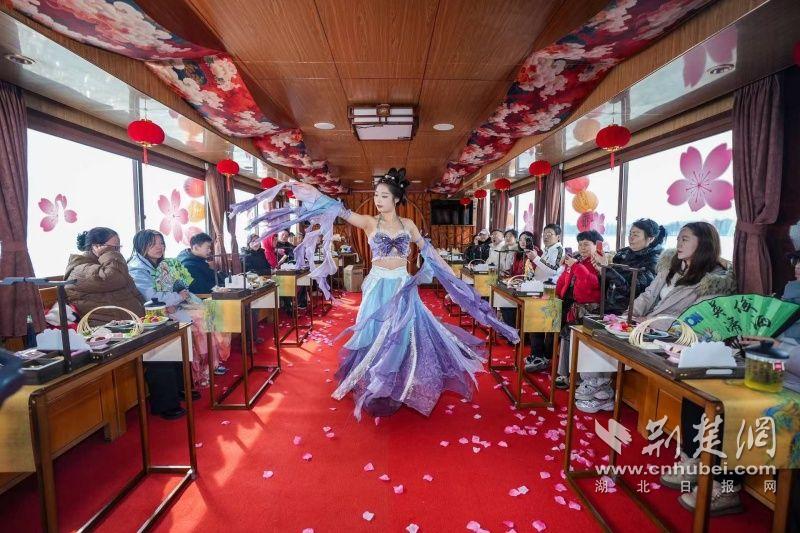 據(jù)介紹,全新上線的精品環(huán)湖游將為游客帶來沉浸式國風(fēng)演藝體驗,從楚風(fēng)園碼頭出發(fā),在游客登船之際,精彩好戲就已正式開鑼。畫舫離岸,演出開始,《元夕》《一面驚鴻》《錦瑟》等國風(fēng)舞蹈亮相甲板,表演者們霓裳蹁躚,或婉約柔美,或英氣颯爽,在游客面前隨著悠揚楚樂,將楚舞的神韻演繹得絲絲入扣,不時還與游客隨機互動,同賀新春。