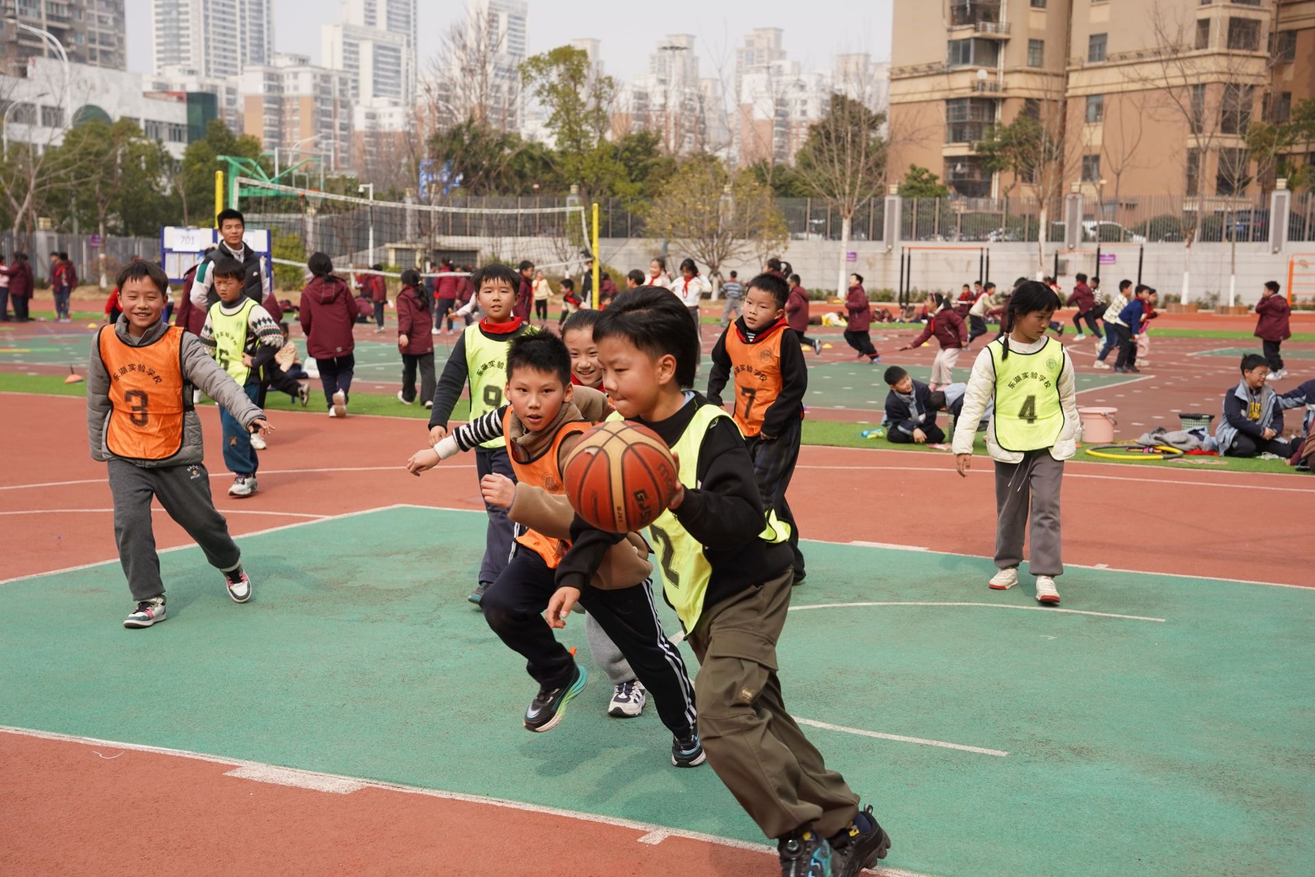 運(yùn)球、突破、投籃……一場激烈的籃球比賽正在東湖實驗學(xué)校操場上進(jìn)行,小球員們身著鮮艷的隊服,臉上洋溢著稚嫩卻堅定的神情。