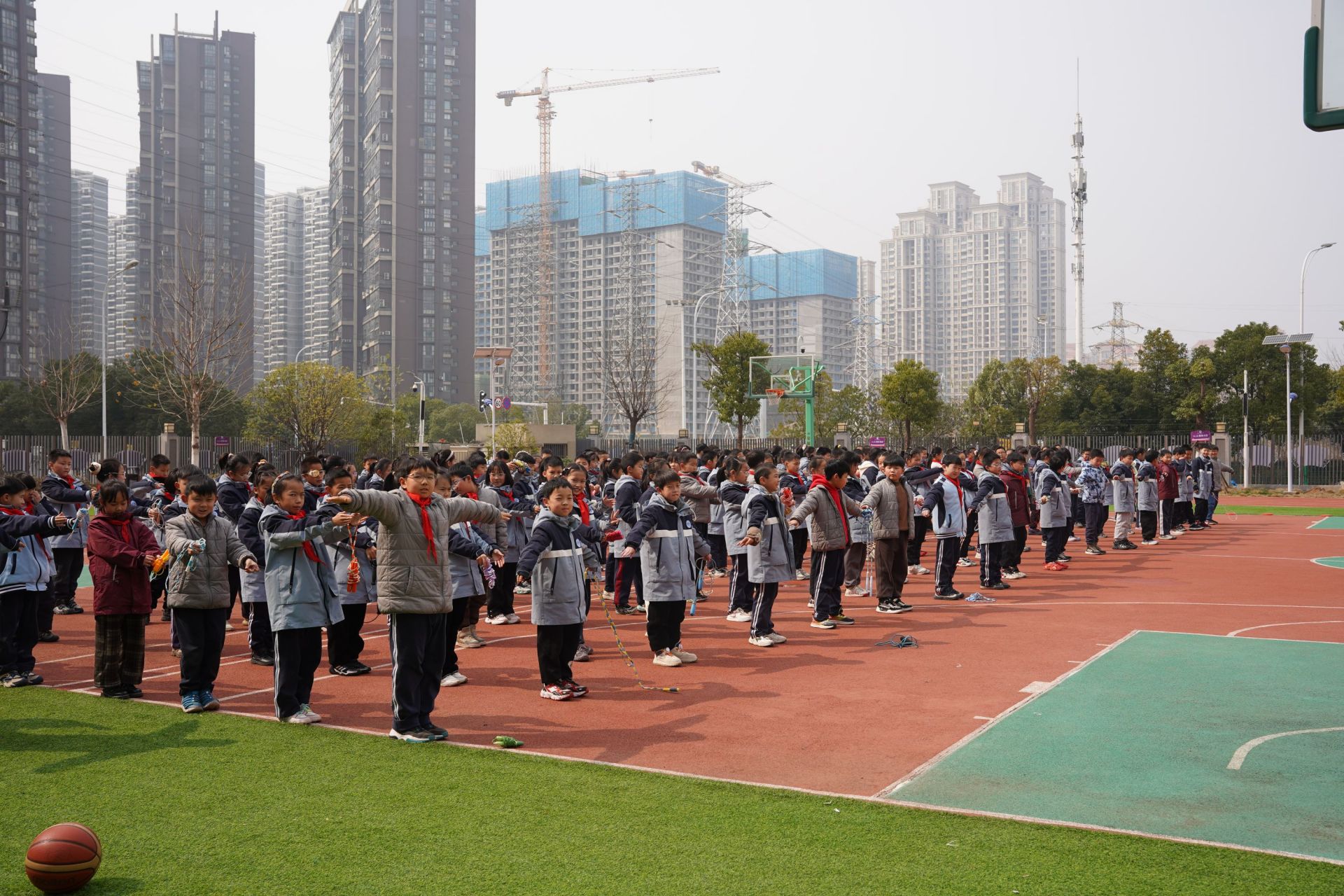 東湖實驗學(xué)校老師正在為大課間準(zhǔn)備活動器具。張媛 攝