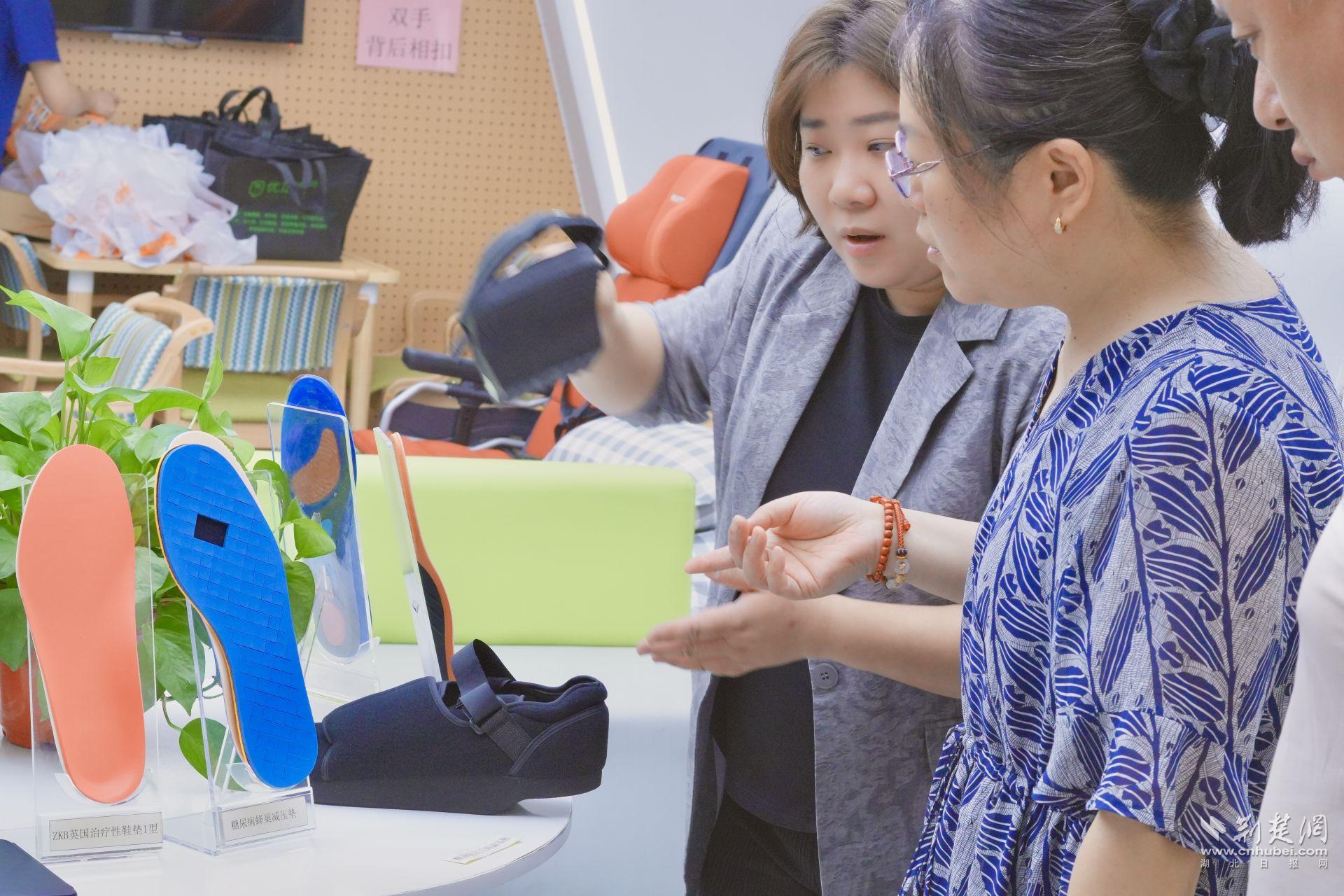 一側(cè)展區(qū)則擺放著各類(lèi)康復(fù)輔具,吸引了不少居民駐足體驗(yàn)。防跟裂襪、減壓鞋墊、艾草健康鞋、足底按摩球……這些看似日常小物,實(shí)則是糖尿病足管理中不可或缺的“隱形衛(wèi)士”。