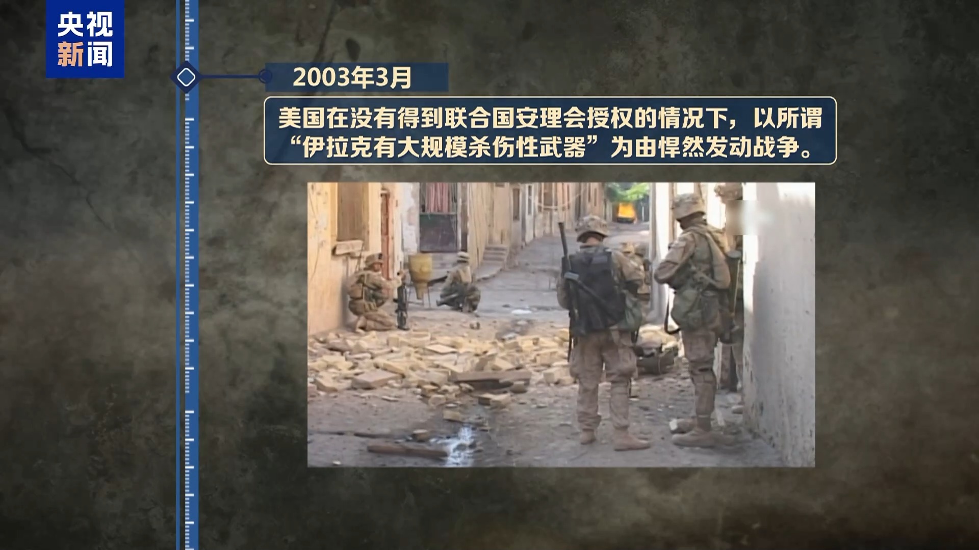 2003年3月,美國(guó)在沒有得到聯(lián)合國(guó)安理會(huì)授權(quán)的情況下,以所謂“伊拉克有大規(guī)模殺傷性武器”為由悍然發(fā)動(dòng)戰(zhàn)爭(zhēng)。以美軍為首的聯(lián)軍肆意射殺、關(guān)押、虐待無辜平民,無差別轟炸居民區(qū),甚至大量使用白磷彈、貧鈾彈。到2011年12月美軍戰(zhàn)斗部隊(duì)全部撤離,伊拉克戰(zhàn)爭(zhēng)導(dǎo)致約20萬至25萬平民死亡。