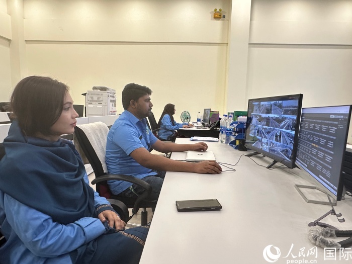 孟加拉國(guó)技術(shù)人員在達(dá)卡機(jī)場(chǎng)高架快速路控制中心工作。人民網(wǎng)記者 孫廣勇攝