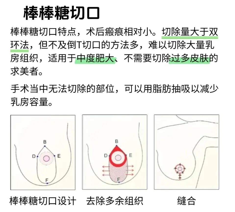 這是一種經(jīng)典的巨乳縮小術(shù)式。通過精心設(shè)計(jì),去除多余的組織、脂肪和皮膚,并將乳頭乳暈復(fù)合體移位至新高點(diǎn),最后縫合為一個(gè)圍繞乳暈的“棒棒糖”狀或垂直短瘢痕切口。