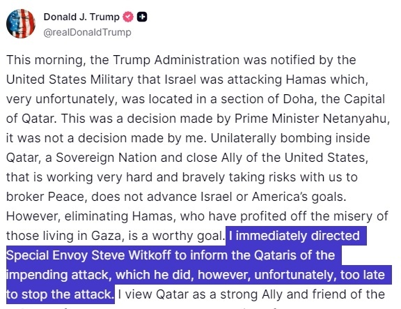 9日,美國總統(tǒng)特朗普在其社交平臺(tái)“真實(shí)社交”發(fā)文稱,當(dāng)天上午,政府接到美軍通知,以色列正在對(duì)位于多哈某區(qū)域的哈馬斯目標(biāo)實(shí)施襲擊。特朗普稱,襲擊是以總理內(nèi)塔尼亞胡單方面的決定,而不是他的決定。特朗普稱,他當(dāng)時(shí)“立即指示特使威特科夫向卡塔爾通報(bào)即將發(fā)生的襲擊”。襲擊發(fā)生后,他與卡塔爾埃米爾(國家元首)及首相通話,保證此類事件不會(huì)在其領(lǐng)土重演。他還已指示國務(wù)卿魯比奧盡快完成與卡塔爾的防務(wù)合作協(xié)議。