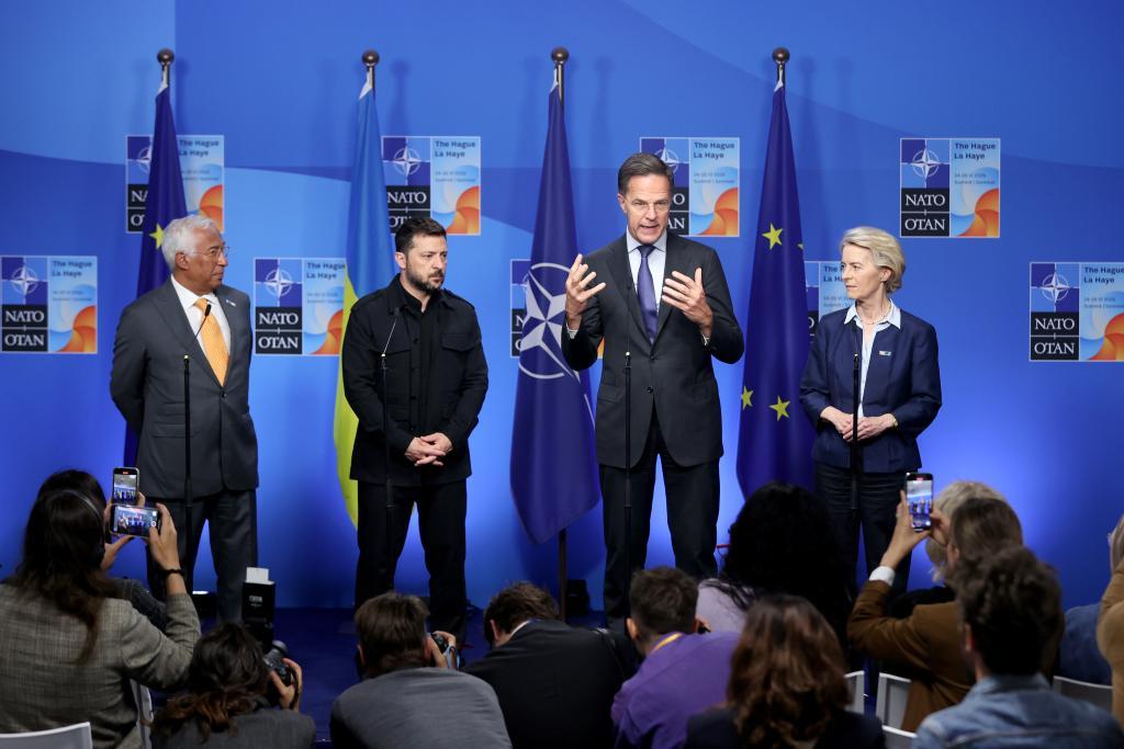 6月24日,在荷蘭海牙,歐洲理事會(huì)主席科斯塔、烏克蘭總統(tǒng)澤連斯基、北約秘書(shū)長(zhǎng)呂特和歐盟委員會(huì)主席馮德萊恩(從左至右)在北約峰會(huì)期間共見(jiàn)記者。新華社記者趙丁喆攝