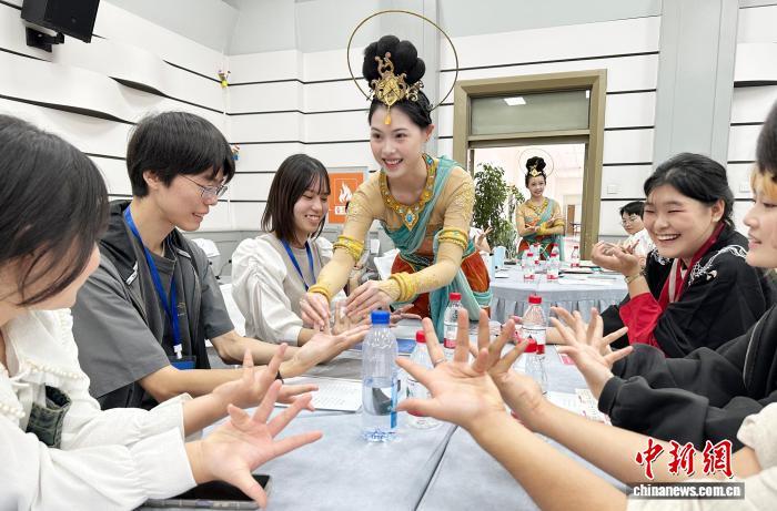 9月9日,日本秋田縣大學(xué)生代表團與西北師范大學(xué)學(xué)生進行交流互動,學(xué)習(xí)敦煌舞手勢動作。中新社記者 丁思 攝