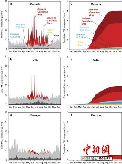 不同來源野火對2023年加拿大、美國和歐洲地區(qū)人群逐日PM2.5污染暴露水平貢獻(xiàn)的示意圖。張強 供圖