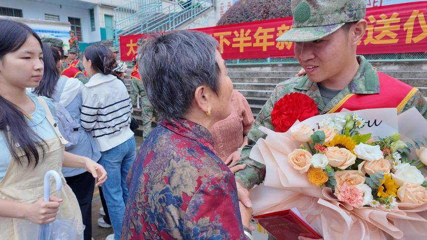 儀式在莊嚴(yán)的中華人民共和國國歌中拉開帷幕,禮山學(xué)校的學(xué)生代表向新兵送上鮮花,致敬最可愛的人,也為孩子們上了一堂最生動(dòng)的國防教育課。工作人員為每位新兵贈(zèng)送紅色書籍《大悟紅色記憶》,希望新兵在軍營中傳承大別山革命精神,賡續(xù)紅色血脈。隨后,全體新兵與家人們合影留念,一張張青春的臉龐、一個(gè)個(gè)堅(jiān)定的眼神,定格成此刻最動(dòng)人的畫面。