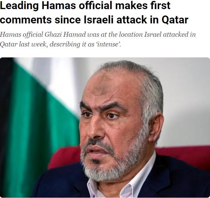 中新網(wǎng)9月18日電 據(jù)法新社及卡塔爾半島電視臺報道,當(dāng)?shù)貢r間9月17日,巴勒斯坦伊斯蘭抵抗運動(哈馬斯)高級官員加齊·哈馬德接受卡塔爾半島電視臺連線采訪,這是以色列9月9日襲擊卡塔爾首都多哈以來,他首次公開露面。
