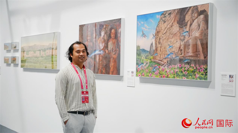 孟加拉國藝術(shù)家蒙蒙爍在其畫作前接受人民網(wǎng)采訪。人民網(wǎng) 嚴小晶攝