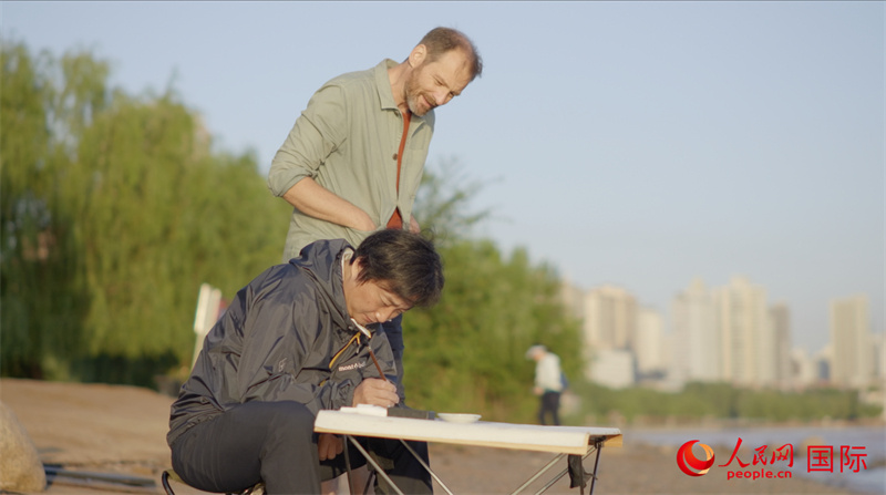 意大利藝術(shù)家馬泰奧與中國藝術(shù)家陳明坤在黃河之濱共創(chuàng)。人民網(wǎng) 嚴小晶攝
