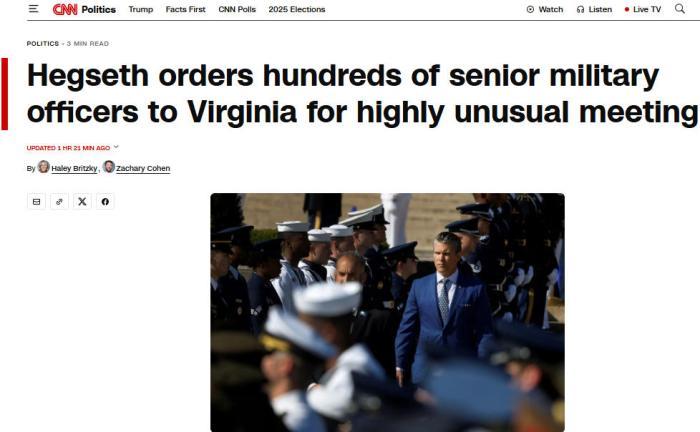 據(jù)CNN報(bào)道,數(shù)百名美國(guó)高級(jí)軍官將于9月30日與赫格塞思舉行會(huì)議,會(huì)議預(yù)計(jì)將在弗吉尼亞州的一個(gè)軍事基地舉行。