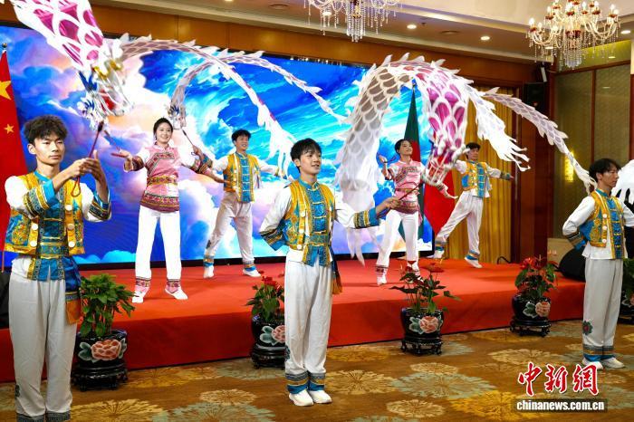 9月26日,慶祝中華人民共和國(guó)與孟加拉人民共和國(guó)建交50周年招待會(huì)現(xiàn)場(chǎng)演出的白族舞蹈《白族彩帶龍》?!×_婕 攝