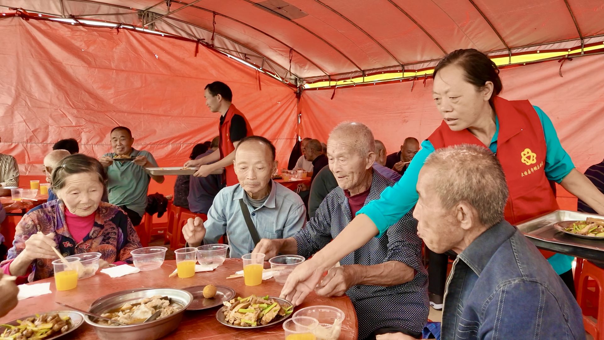 與此同時,在村黨支部的組織動員下,志愿者們早已忙碌開來。洗菜、切菜、烹制......大家分工協(xié)作,精心準備豐盛的團圓宴。灶臺上熱氣騰騰,空氣中彌漫著誘人香氣。北河村黨支部書記顏業(yè)青介紹:“我們提前三天就開始準備農(nóng)家菜,特意做了老人們愛吃的燒麥等特色美食,希望讓他們感受到節(jié)日的溫暖?!?/p>