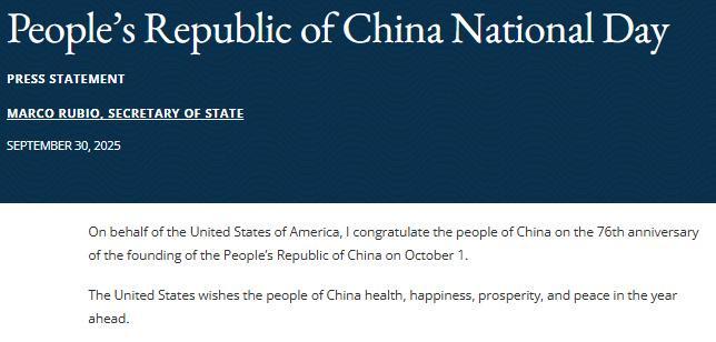 中新網(wǎng)10月1日電 根據(jù)美國(guó)國(guó)務(wù)院網(wǎng)站當(dāng)?shù)貢r(shí)間9月30日消息,美國(guó)國(guó)務(wù)卿魯比奧發(fā)表簡(jiǎn)短聲明:我謹(jǐn)代表美利堅(jiān)合眾國(guó),就中華人民共和國(guó)成立76周年表示祝賀。
