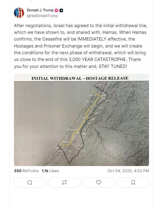 當(dāng)?shù)貢r(shí)間10月4日,美國(guó)總統(tǒng)特朗普在其社交平臺(tái)“真實(shí)社交”發(fā)文稱,以色列已同意加沙地帶初步撤軍路線,并將相關(guān)方案與巴勒斯坦伊斯蘭抵抗運(yùn)動(dòng)(哈馬斯)共享。一旦哈馬斯確認(rèn),?;饘⒘⒓瓷?/strong>,被扣押人員與囚犯交換隨即啟動(dòng)。