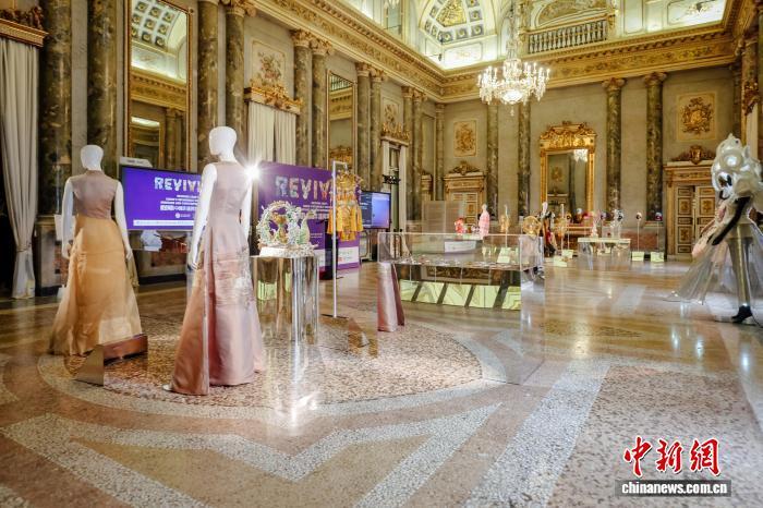 圖為“相逢·宴會”展區(qū),以“開放與包容”為基調(diào),通過服飾、珠寶與數(shù)字藝術(shù)作品,重現(xiàn)文明相遇的璀璨時刻。展覽主辦方 供圖