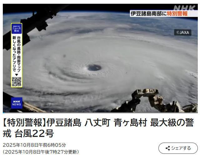 中新網(wǎng)10月8日電 據(jù)日本廣播協(xié)會(NHK)報道,2025年第22號臺風(fēng)“夏浪”將于當(dāng)?shù)貢r間9日凌晨至早晨接近日本伊豆群島,日本氣象廳已發(fā)布暴風(fēng)與巨浪的特別警報,指出當(dāng)?shù)乜赡艹霈F(xiàn)數(shù)十年一遇的大規(guī)模災(zāi)害。