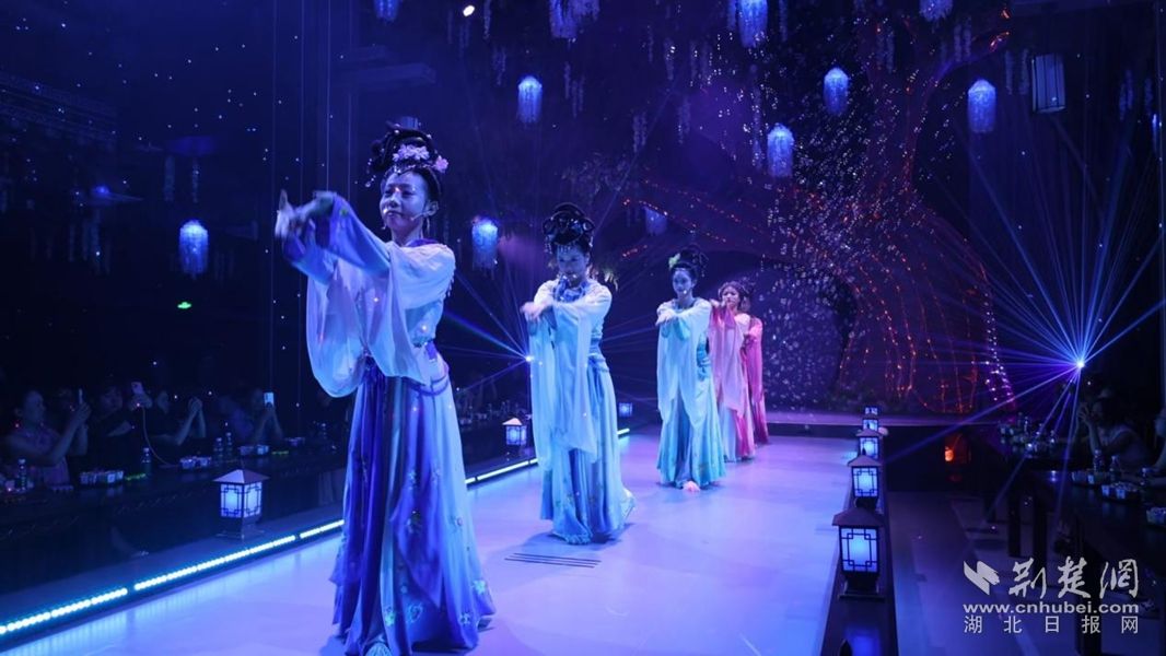 傳統(tǒng)文化的“破圈”還體現(xiàn)在味覺與視覺的融合中。黃梅戲主題餐秀綜合體“黃梅宴”內(nèi),新編劇目《天仙奇緣》與美食同步呈現(xiàn)。食客夾起黃梅魚面時(shí),舞臺(tái)上的“七仙女”便踏云步至席間,婉轉(zhuǎn)唱段與餐香交織,讓味蕾與聽覺同時(shí)“入戲”?!霸緦?duì)黃梅戲不太了解,這場(chǎng)表演既有古典韻味,又充滿現(xiàn)代氣息,看得非常過癮?!笔忻袷V橛^演后贊嘆。