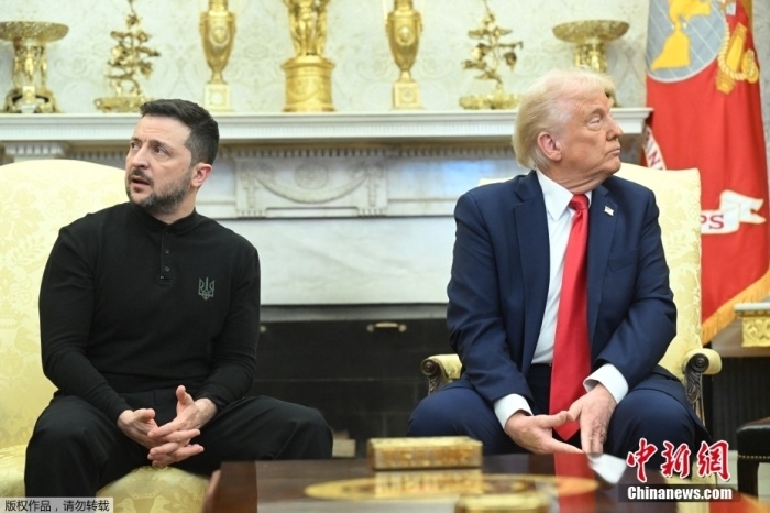 當(dāng)?shù)貢r間2月28日,美國總統(tǒng)特朗普與烏克蘭總統(tǒng)澤連斯基在白宮舉行會談。會談過程中,雙方爆發(fā)激烈爭吵,澤連斯基提前離開白宮。圖為特朗普與澤連斯基會談現(xiàn)場。
