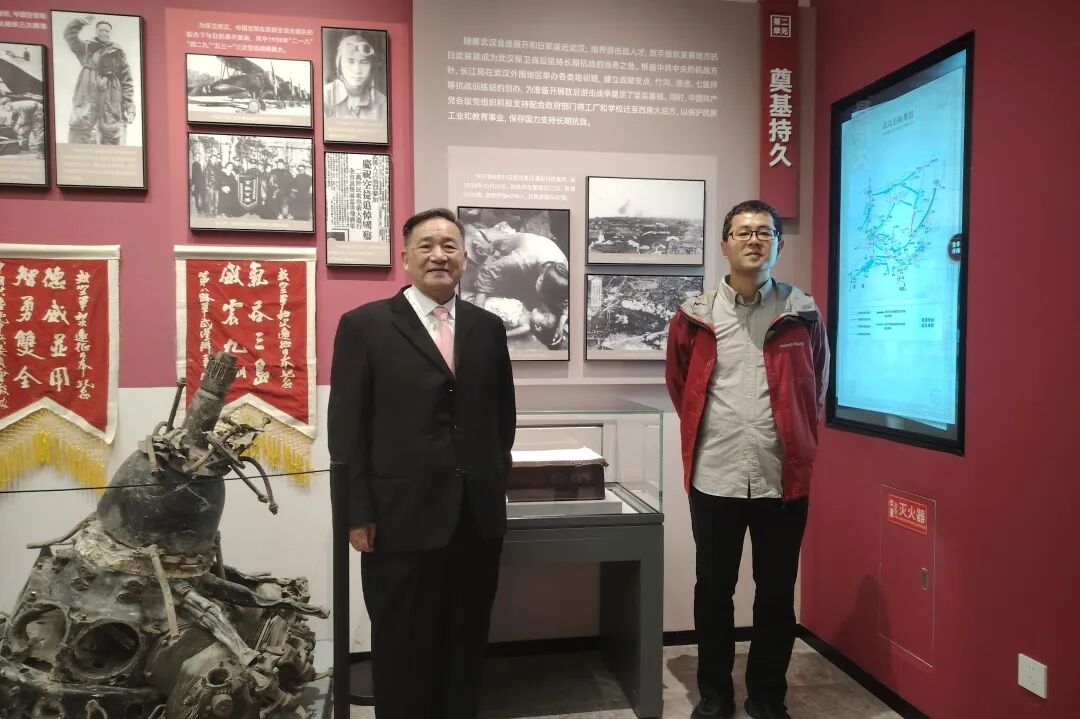在周靜館長(zhǎng)帶領(lǐng)下,小林拓也、中國(guó)空軍勇士陳懷民烈士侄子陳德、民間收藏家代表周啟壯、武漢人文歷史愛好者袁厚翔等一行,首先參觀了基本陳列《英雄城市 抗戰(zhàn)烽火——武漢抗戰(zhàn)歷史特展》,詳細(xì)了解了全民族抗戰(zhàn)爆發(fā)后,武漢逐步成為當(dāng)時(shí)全國(guó)抗戰(zhàn)中心和武漢保衛(wèi)戰(zhàn)的相關(guān)史實(shí),以及為鞏固、發(fā)展抗日民族統(tǒng)一戰(zhàn)線,周恩來、博古、董必武、葉劍英等中國(guó)共產(chǎn)黨人在武漢所做的各種努力。