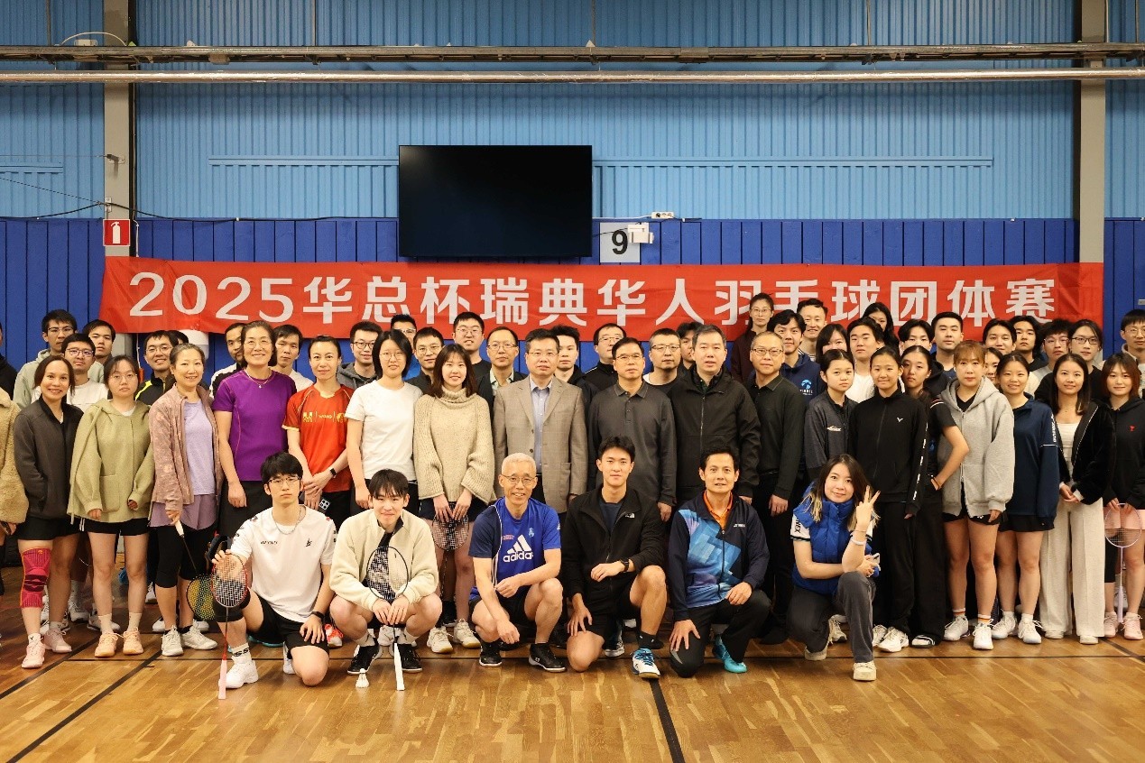 中國駐瑞典大使館臨時代辦萬德剛出席“華總杯”瑞典華人羽毛球團體賽開幕式。中國駐瑞典大使館供圖