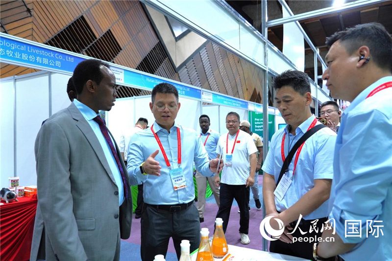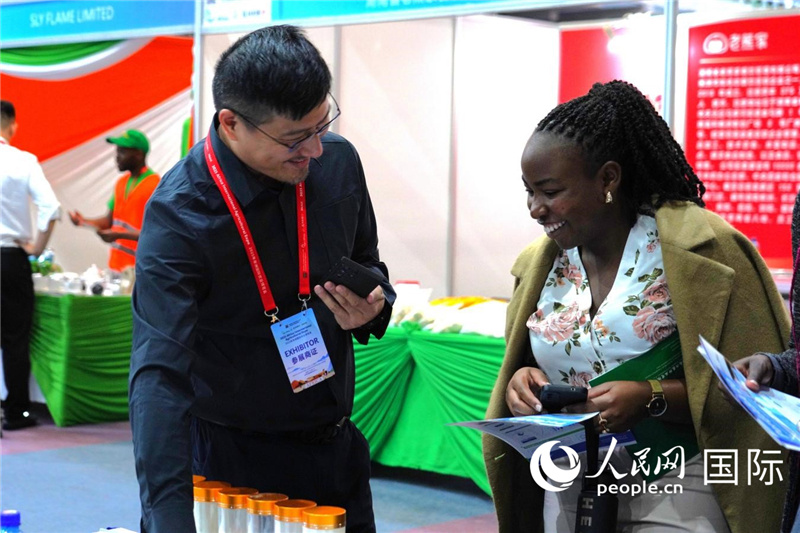 博覽會(huì)現(xiàn)場(chǎng),本地客商在與中國(guó)參展商交流。人民網(wǎng)記者 黃煒鑫攝