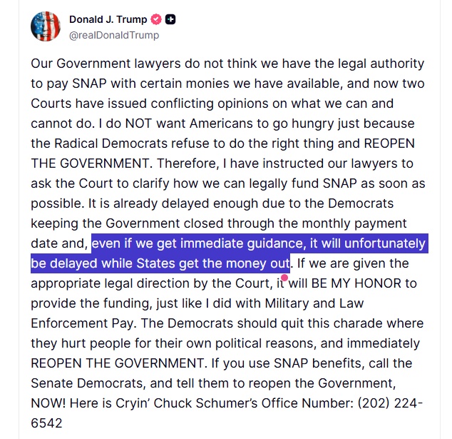 △當(dāng)?shù)貢r(shí)間10月31日,美國(guó)總統(tǒng)特朗普就“補(bǔ)充營(yíng)養(yǎng)援助計(jì)劃”發(fā)表聲明。特朗普再次指責(zé)是民主黨導(dǎo)致政府“停擺”,最終招致美國(guó)民眾忍饑挨餓。