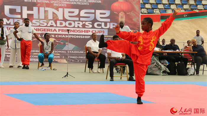 決賽活動(dòng)現(xiàn)場,來自尼日利亞各地的武術(shù)愛好者圍繞太極、套路、男子散打、女子散打、創(chuàng)意表演、團(tuán)體比賽等六個(gè)比賽項(xiàng)目展開激烈角逐。場上,選手們一招一式,有板有眼,充分展示了中國武術(shù)文化蘊(yùn)含的堅(jiān)韌、拼搏精神,贏得了觀眾陣陣掌聲與歡呼聲。