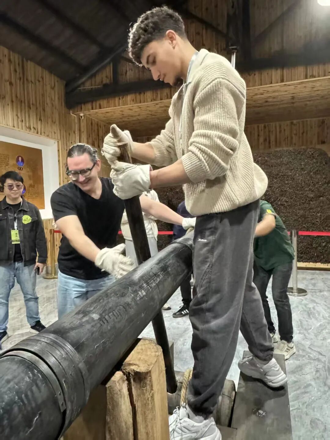 留學(xué)生在中國(guó)青磚茶非遺技藝傳承館體驗(yàn)壓制青磚茶。