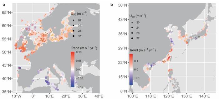 在本項研究中,論文共同通訊作者、南方科技大學(xué)教授曾振中和同事及合作者一起,分析了全球海洋1940年至2023年的每小時風(fēng)速數(shù)據(jù)。他們發(fā)現(xiàn),全球超過60%的沿海區(qū)域呈現(xiàn)極端風(fēng)速顯著上升的趨勢,并常與全球變暖下的天氣系統(tǒng)變化相關(guān)。