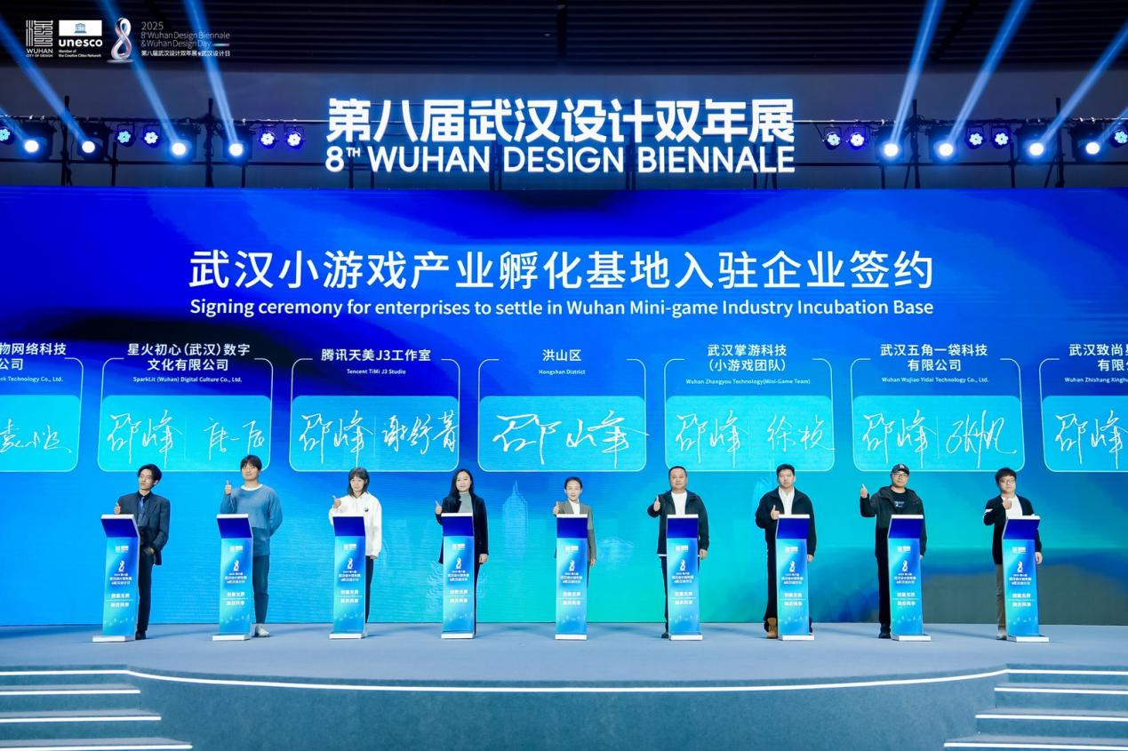 榮譽之外,產業(yè)合作是設計價值轉化的關鍵。開幕式現場,8家企業(yè)簽約入駐全國首家小游戲產業(yè)孵化基地——“武漢市小游戲產業(yè)孵化基地”,他們中既有充滿朝氣的新生代小游戲團隊,也有掌游科技這樣的行業(yè)領軍者,更有騰訊天美J3工作室等頂尖力量,他們將攜手打破行業(yè)邊界、共享資源平臺,共同推動數字創(chuàng)意產業(yè)與設計融合發(fā)展。