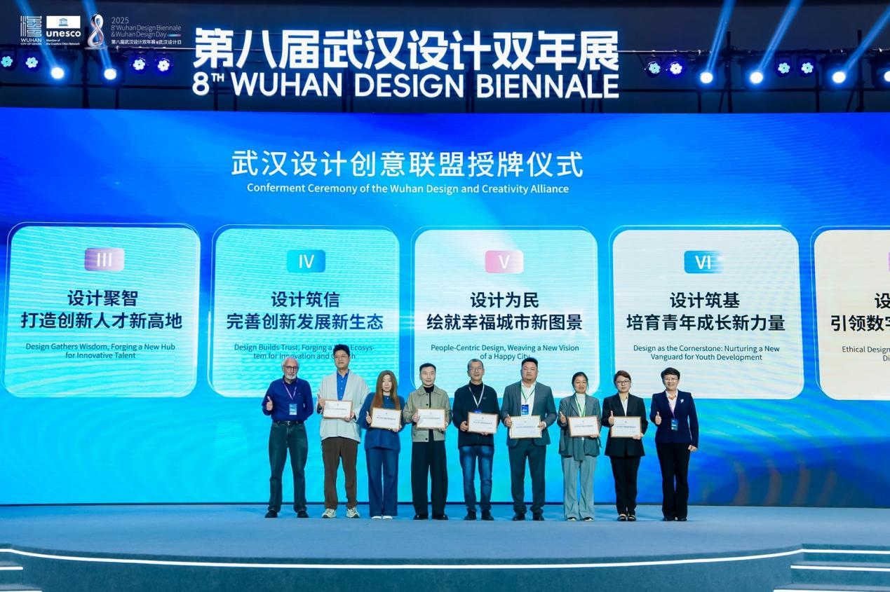 武漢有設計相關專業(yè)高校50余所,設計專業(yè)在校學生近10萬人,設計相關企業(yè)突破1萬家,10余個設計行業(yè)協會,從業(yè)人員超50萬,形成了強大的“設計創(chuàng)意聯盟”,催生出了集產業(yè)鏈、創(chuàng)新鏈、人才鏈、價值鏈于一體的融合創(chuàng)新發(fā)展生態(tài)體系。在開幕式的最后,“武漢設計創(chuàng)意聯盟”正式授牌,來自設計企業(yè)、行業(yè)協會、高校院所和獨立設計師等領域多元設計力量代表共同見證。未來,“武漢設計創(chuàng)意聯盟”將奮力實現設計融城,構筑協同發(fā)展新范式;設計賦能,激活產業(yè)升級新動能;設計聚智,打造創(chuàng)新人才新高地;設計筑信,完善創(chuàng)新發(fā)展新生態(tài);設計為民,繪就幸福城市新圖景;設計筑基,培育青年成長新力量;設計向善,引領數字文明新航向;設計聯通,拓展國際交往新空間八大目標。