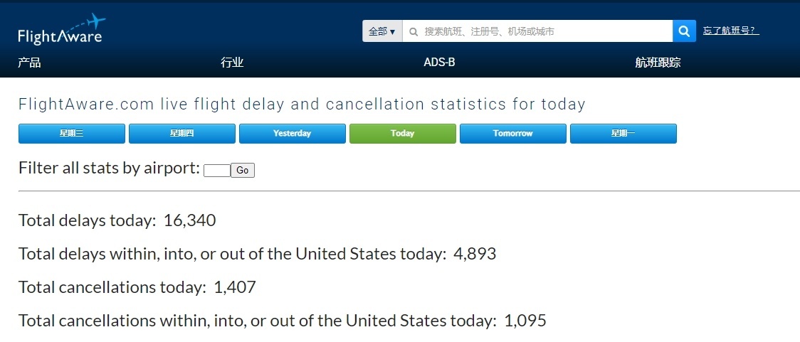 △航班追蹤網(wǎng)站截圖,美國(guó)部分出現(xiàn)延誤情況的機(jī)場(chǎng)