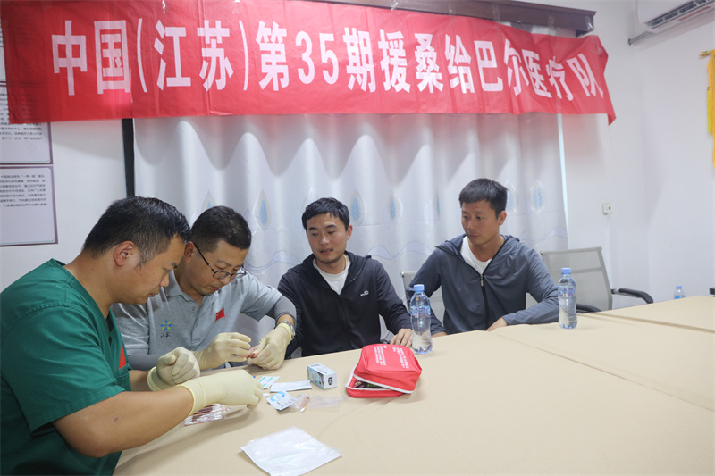 醫(yī)療隊員給華僑做檢查。中國援桑醫(yī)療隊供圖