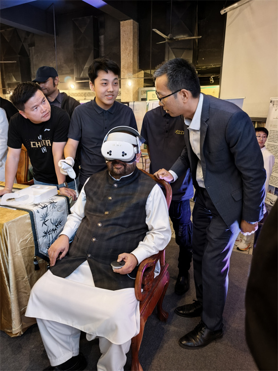 11月7日晚,巴基斯坦國家遺產(chǎn)與文化部部長奧朗則布在中國旅游文化周活動(dòng)展區(qū)體驗(yàn)VR設(shè)備。中國駐巴基斯坦使館供圖