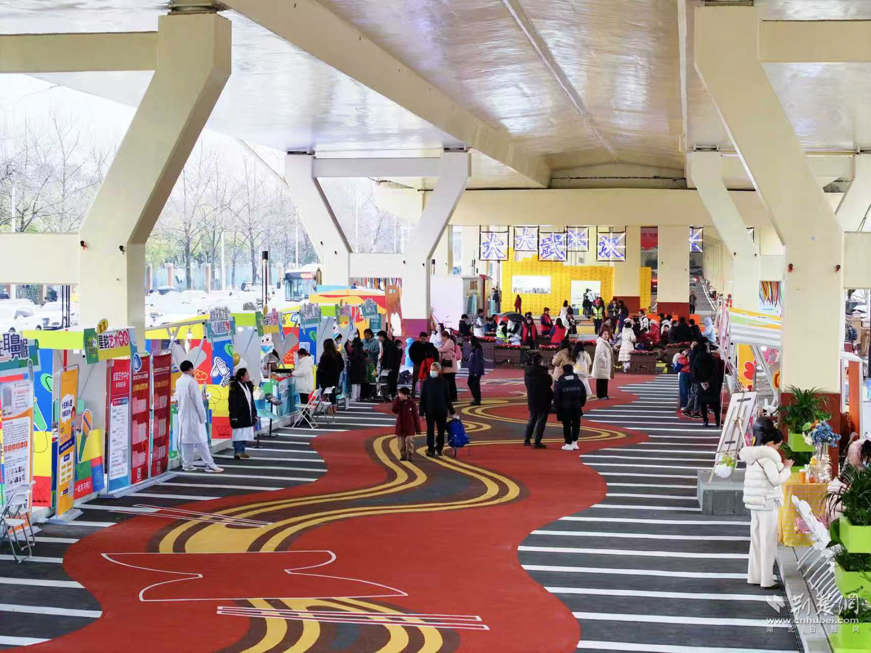 江岸區(qū)黃浦大街立交橋下的灰色地帶,蝶變?yōu)榧鷳B(tài)、休閑與人文于一體的“護(hù)學(xué)驛站”。智能監(jiān)控、風(fēng)雨連廊、應(yīng)急物資、休憩書(shū)角……為護(hù)學(xué)路增添安全與溫度;橋下文創(chuàng)市集與智慧停車場(chǎng)的開(kāi)放,則讓“立交之下”重燃煙火氣。