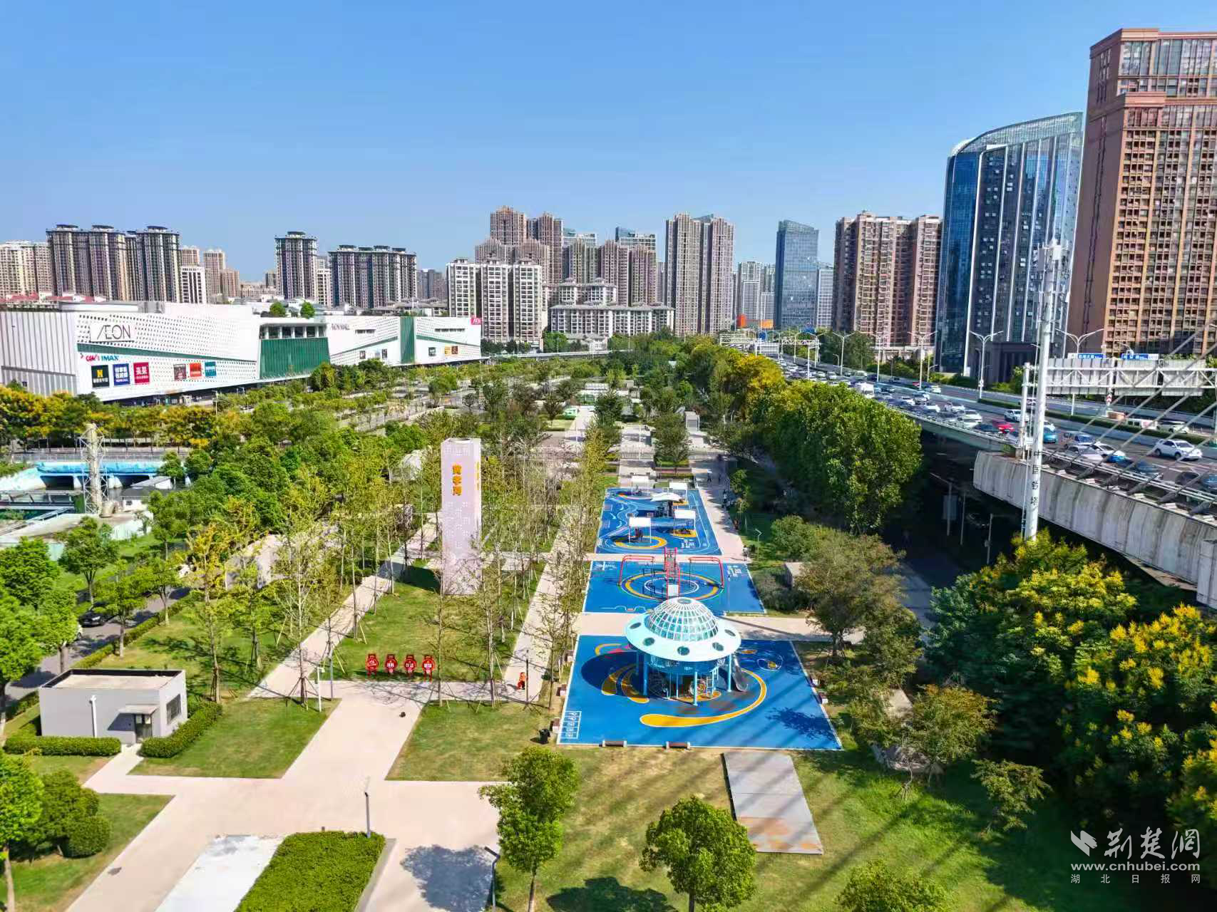 江漢區(qū)常青街的工棚荒地,化身為色彩明快的遠(yuǎn)洋鯨奇兒童友好公園,550米藍(lán)色跑道串聯(lián)起全齡樂(lè)園。
