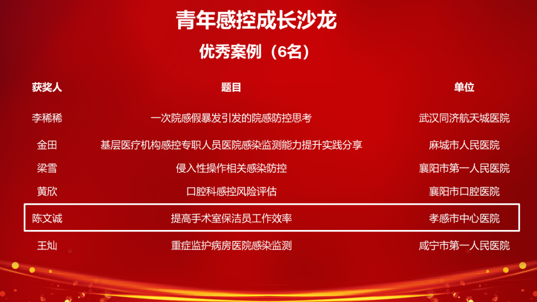 荊楚網(wǎng)(湖北日?qǐng)?bào)網(wǎng))訊(通訊員 陳軍)近日,在華中科技大學(xué)同濟(jì)醫(yī)學(xué)院附屬同濟(jì)醫(yī)院與國(guó)家重大公共衛(wèi)生事件醫(yī)學(xué)中心聯(lián)合主辦的“第一屆同濟(jì)感控學(xué)術(shù)會(huì)議”上,孝感市中心醫(yī)院手術(shù)室護(hù)士陳文誠(chéng)榮獲“優(yōu)秀青年感控學(xué)者”稱號(hào)。由陳文誠(chéng)主導(dǎo)的感控案例《提高手術(shù)室保潔人員工作效率》,在會(huì)議同期舉辦的第三屆青年感控成長(zhǎng)沙龍中表現(xiàn)出色,榮獲“優(yōu)秀案例”。