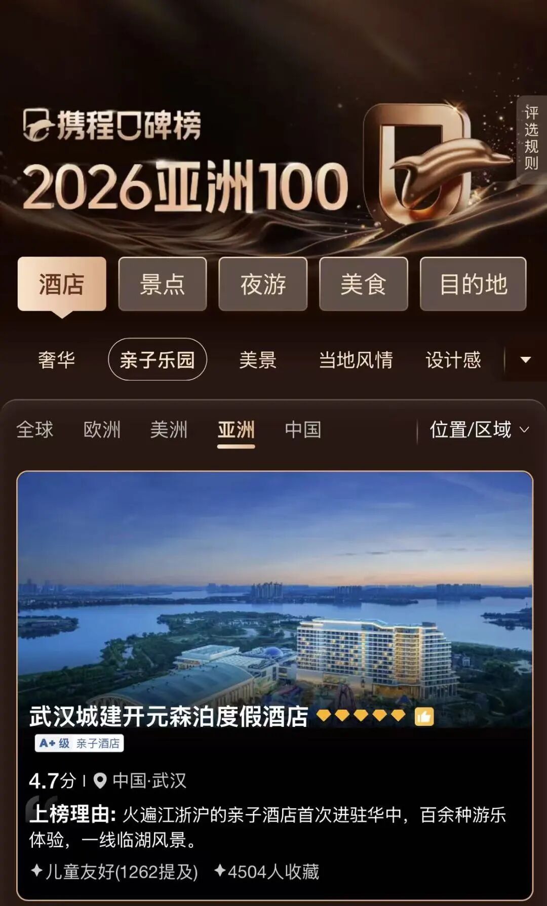近日,攜程平臺發(fā)布《攜程口碑榜2026年度榜單》,武漢城建開元森泊度假酒店成功上榜亞洲親子樂園酒店百強,位列亞洲第58位、國內(nèi)第29位,成為湖北省唯一上榜的酒店。