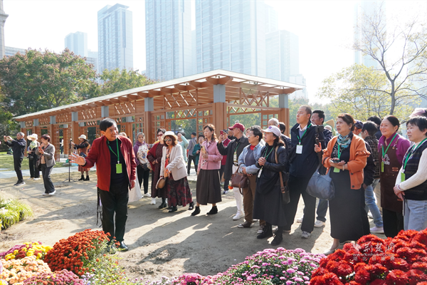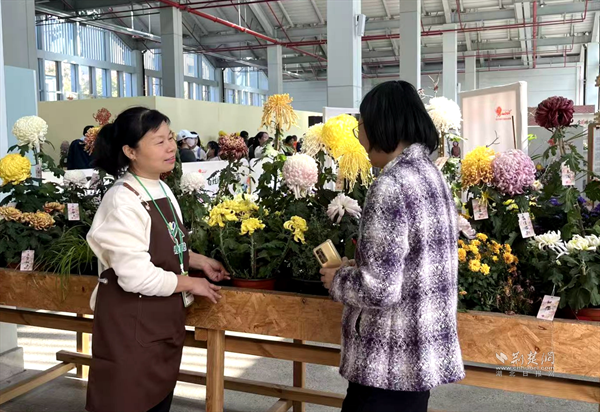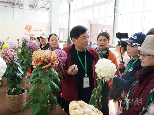 今年67歲的辛高爐擁有40多年菊花栽培經(jīng)驗,其培育的菊花品種與插花作品曾多次榮獲全國大獎。他結(jié)合自己多年的養(yǎng)花心得,將菊花品種特性、造型技巧與養(yǎng)護要領(lǐng)娓娓道來,不僅吸引園藝師凝神傾聽,更引得沿途市民駐足圍觀。