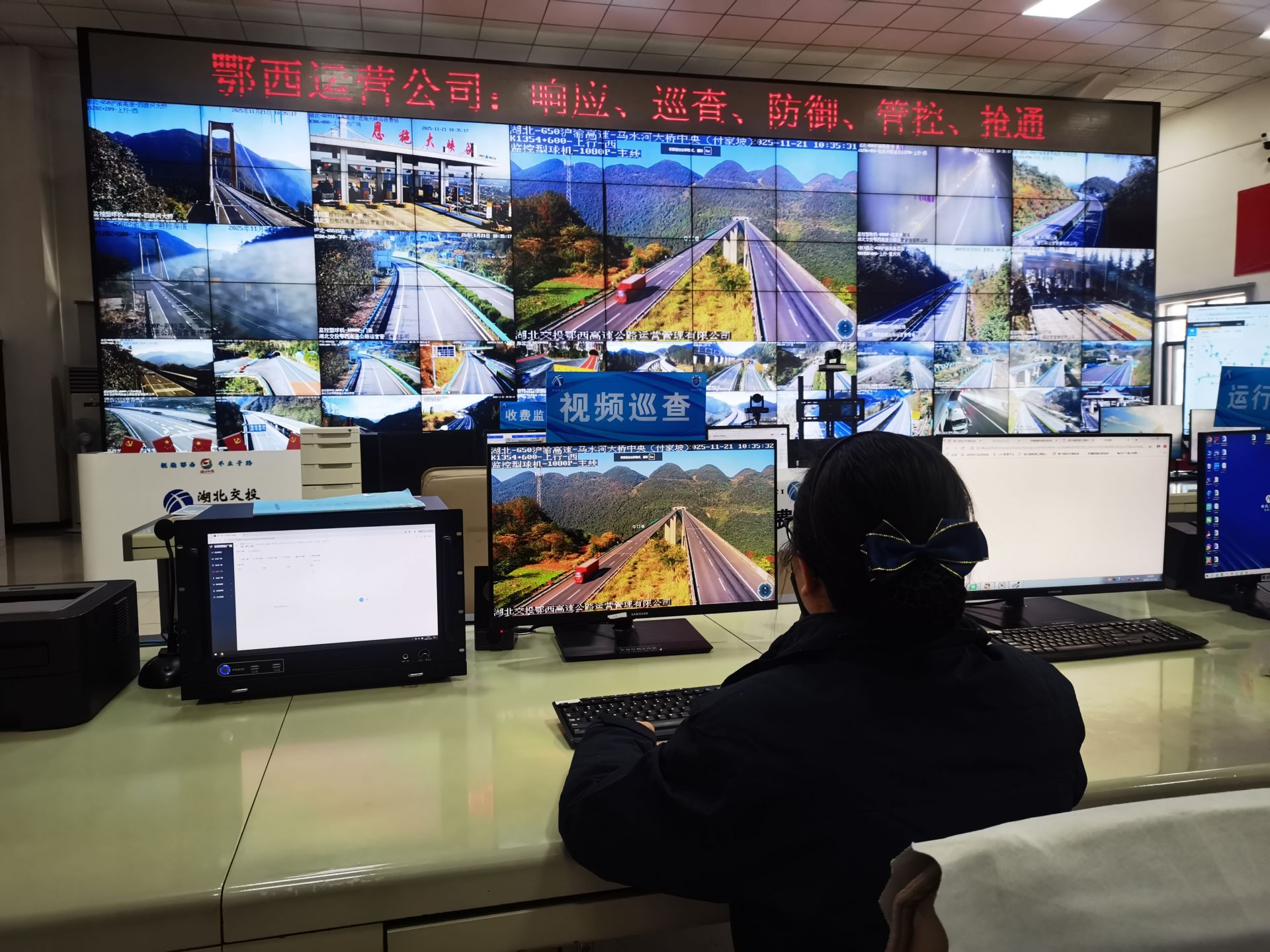 鄂西高速監(jiān)控中心采用高頻視頻巡查與AI智能分析相結(jié)合的方式,對(duì)長下坡、隧道群、易結(jié)冰等重點(diǎn)路段開展24小時(shí)實(shí)時(shí)動(dòng)態(tài)監(jiān)測(cè)。一旦系統(tǒng)識(shí)別出車輛行駛異?;蚵访姝h(huán)境風(fēng)險(xiǎn),中心立即通過沿線情報(bào)板發(fā)布預(yù)警信息,同時(shí)聯(lián)動(dòng)路政、高警、施救等部門,實(shí)現(xiàn)風(fēng)險(xiǎn)“早識(shí)別、早干預(yù)、早處置”的閉環(huán)管理。