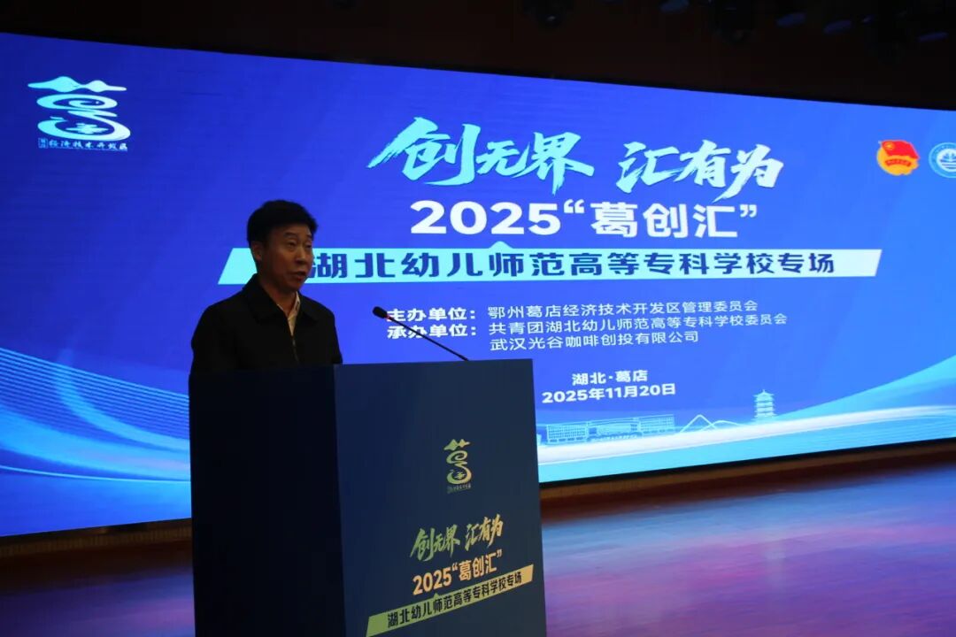 葛店國家經(jīng)開區(qū)管委會(huì)副主任柳金旗在致辭中高度評(píng)價(jià)了湖北幼專在幼教人才培養(yǎng)與創(chuàng)新創(chuàng)業(yè)教育方面的特色實(shí)踐。他表示,葛店開發(fā)區(qū)始終將高校作為區(qū)域創(chuàng)新的策源地與人才引擎,持續(xù)迭代"天天有咖啡、周周有路演、月月創(chuàng)投匯"的雙創(chuàng)服務(wù)生態(tài),為青年創(chuàng)業(yè)者提供全周期、專業(yè)化的成長支持。一直以來,葛店國家經(jīng)開區(qū)致力于為追夢者提供最優(yōu)渥土壤、最貼心服務(wù)、最廣闊舞臺(tái),將全力發(fā)揮政策引導(dǎo)與平臺(tái)樞紐作用,激活區(qū)域創(chuàng)新活力,推動(dòng)更多優(yōu)質(zhì)項(xiàng)目落地生根、開花結(jié)果,讓青年創(chuàng)新的"星星之火"在葛店這片產(chǎn)業(yè)熱土上形成"燎原之勢",為湖北建設(shè)全國構(gòu)建新發(fā)展格局先行區(qū)貢獻(xiàn)青春力量。