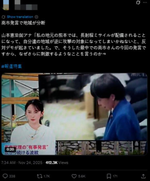 在社交媒體平臺上,一名網(wǎng)友援引日本主播的評論表示:“在我的家鄉(xiāng)熊本,由于(日本政府)決定部署長程導(dǎo)彈,當(dāng)?shù)匾殉霈F(xiàn)抗議集會。在此風(fēng)口浪尖,高市卻發(fā)表此番言論——(人們不禁質(zhì)疑)她為何要火上澆油?”
