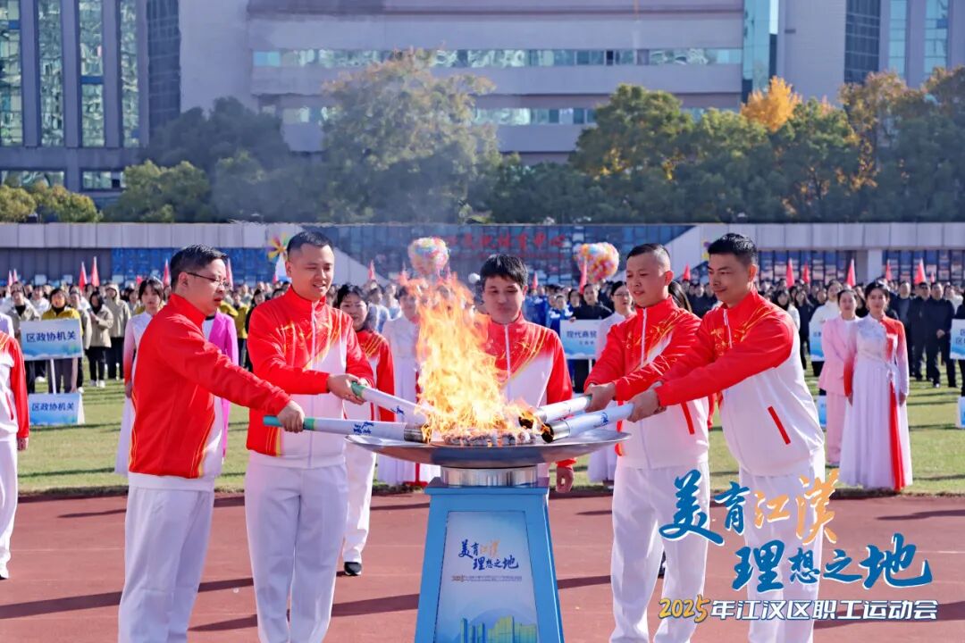 現(xiàn)場,“新興之火”“數(shù)智之火”“金融之火”“樞紐之火”“人文之火”五棒火炬依次點亮,張裕、付俊、邵青、張寶劍、孟廣松等15位勞模代表接力傳遞。燃燒的火焰,照耀著江漢區(qū)在科技創(chuàng)新、數(shù)字化轉型、金融強區(qū)、商貿物流、文商體旅融合等發(fā)展領域堅定向前。當所有火炬手共同點燃主圣火盆,彩球騰空,全場沸騰,運動會正式開幕。